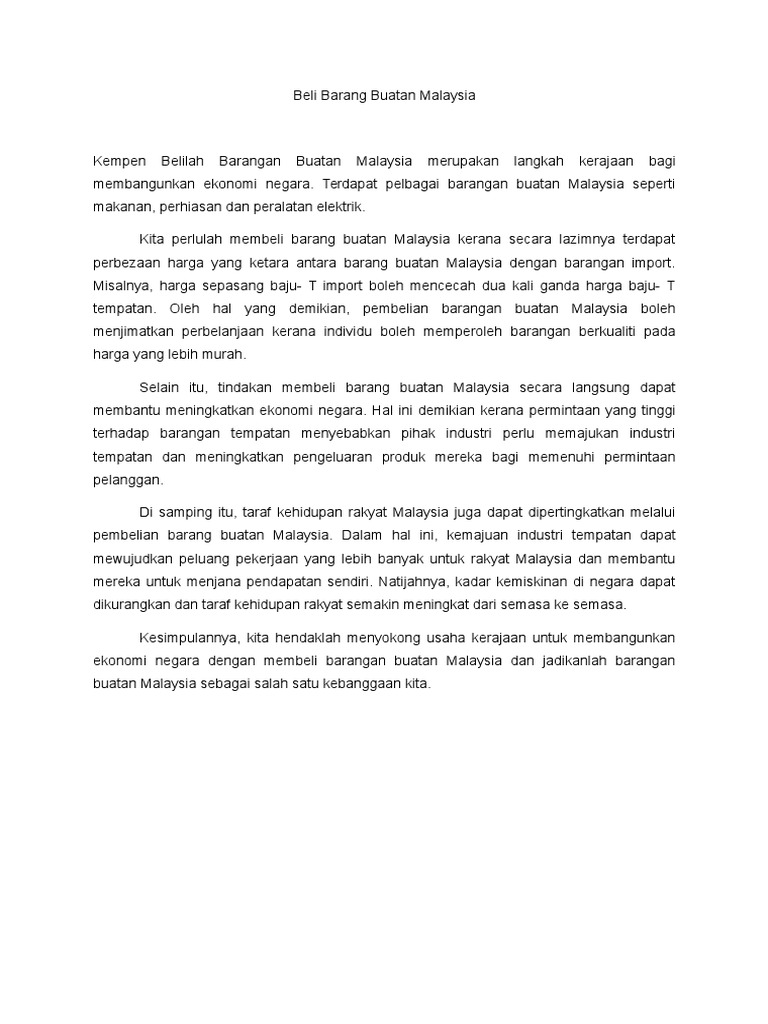 Negaraku Tanah tumpahnya darahku Rakyat hidup bersatu dan maju. Malaysia merupakan sebuah negara yang. Di bawah dikongsikan contoh karangan berkaitan peranan ibu bapa untuk menggalakkan anak-anak dalam membeli barangan buatan Malaysia.